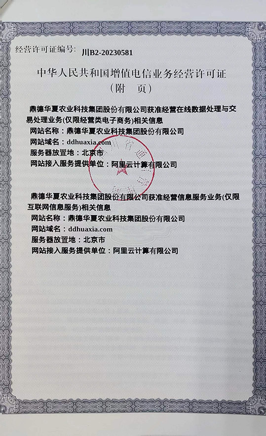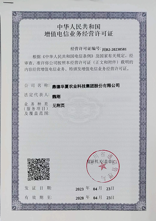 近日,鼎德華夏農業科技集團股份有限公司獲得由工業和信息化部審批,四川省通信管理局頒發的《中華人民共和國增值電信業務經營許可證》。